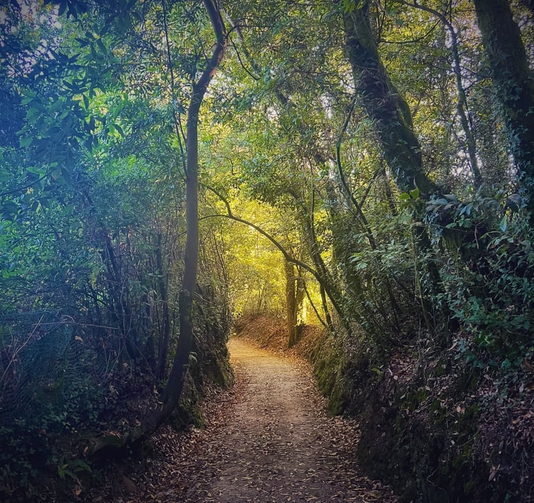 In the verdant heart of Galicia, the Camino Inglés winds through mystical holloways, those sunken lanes etched into the landscape by centuries of pilgrim footsteps. These corridors of greenery, enclosed by the intertwining branches of ancient trees and the embrace of overgrown foliage, create a secluded world away from the outside bustle. Walking these earthen paths, pilgrims find themselves enveloped in an almost cathedral-like silence, the rustle of leaves and the soft give of soil underfoot the only sounds. This seclusion is a gift to the spirit, a chance to turn inwards and commune with the deeper aspects of self, an unparalleled opportunity for mindfulness amidst the whispers of nature. As the dappled sunlight filters through the leafy canopy, each step becomes a meditative practice, and the Galician holloways transform into serene aisles of reflection, offering a profound connection to the spiritual essence of the Camino.